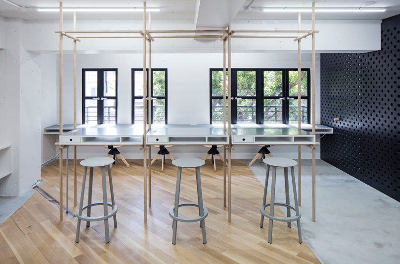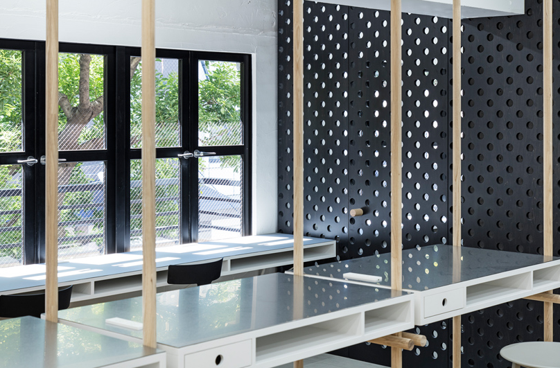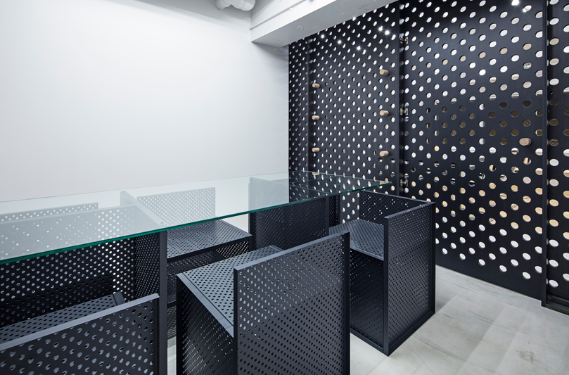 辦公室細(xì)節(jié)設(shè)計(jì)中使用的穿孔材料是公司自身產(chǎn)品制成的。這些穿孔,也用于E&Y生產(chǎn)的家具,在空間尺度上表達(dá)了企業(yè)的身份。該材料還用于傳輸空氣和光,減輕了行政室和會(huì)議室的限制條件。這些孔足夠大,可以插入用作門把手和擱板定位銷的木棍。員工可以在任何方便的位置輕松安排貨架。