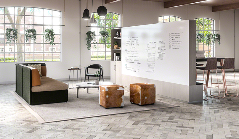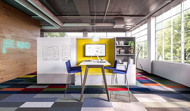 由于Steelcase尋求在開放空間和個人辦公室之間找到一個折衷方案,所以在他們在辦公室裝修中除了工作站之外,該公司還提出了協(xié)作要素。為了支持團隊合作和工作場所內(nèi)的共享,這些元素允許為演示和會議以及接觸設置一個開放的布局空間。