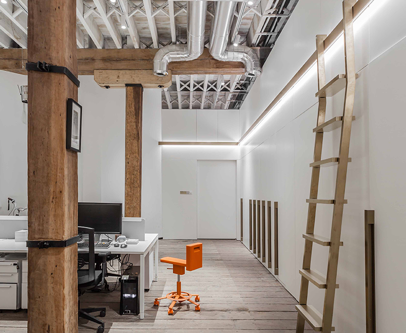 辦公室裝修除百年木結(jié)構(gòu)外,采用黃銅、玻璃、大理石、不銹鋼等現(xiàn)代材料,實(shí)現(xiàn)歷史與現(xiàn)代的對(duì)話。建筑師沒有按照傳統(tǒng)辦公室裝修設(shè)計(jì)中常見的隱私或效率水平來組織空間。相反,他們根據(jù)相互作用的可能性來安排空間。工作區(qū)位于中間,由輔助材料空間、觀眾空間、金色書架和討論區(qū)包圍,成為信息處理中心,增加了互動(dòng)的可能性。