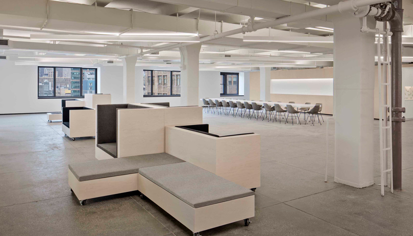 辦公室裝修的主空間,沿著整個后墻,一系列柯里安式壁龕為臨時站立會議和活動服務站提供了空間。雕刻在墻上,隱藏在繁忙的活動的主要空間是一個工作圖書館與個人電話亭相結合的深入工作。此外,這面墻還為廚房、衣柜、浴室、IT室和較小的工作人員會議室創造了特定的壁龕。
