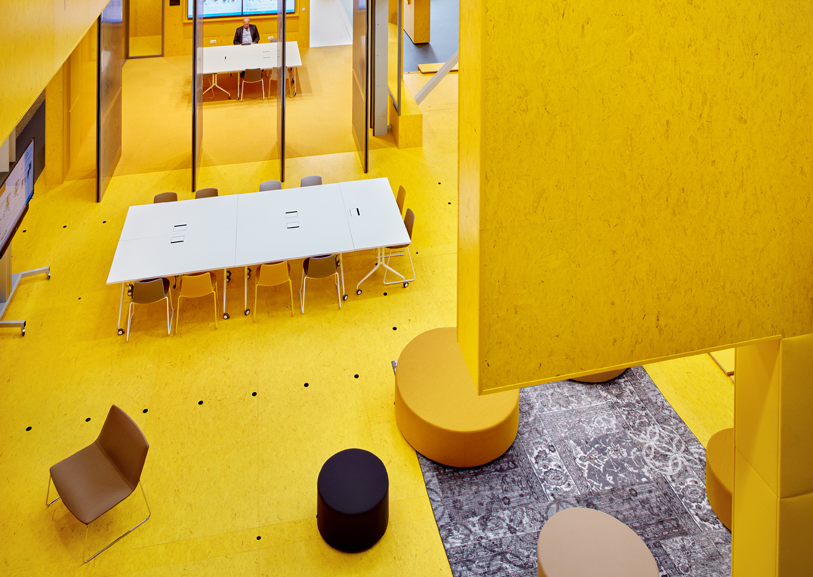 最后的辦公室裝修設計靈感來自于建筑實驗家和藝術家的一件黃色的3D小藝術品??死锝?middot;德科寧,將大禮堂內現有的四個不同樓層連接起來,為工作提供各種解決方案。