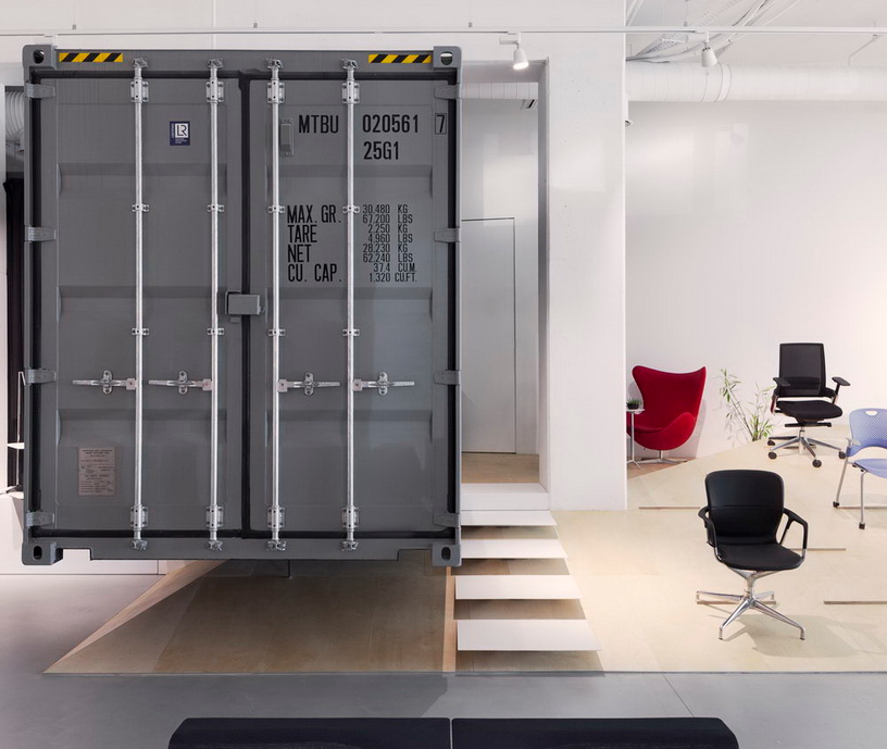 辦公室裝修傾斜的膠合板平臺允許椅子的高度安排,并通過這種方式暴露在每一個觀賞點。這個木制元素垂直向上,動態地圍繞著接待區,“引導”顧客從展廳的入口到經理區。在集裝箱和膠合板平臺外,整個辦公室裝修空間的設計盡量減少使用材料-混凝土地板、白色墻壁、天花板和設施。這一設計,結合航運集裝箱,辦公室裝修創造了一個簡單的工業外觀,強調復雜的模式和精確的細節所展示的家具。