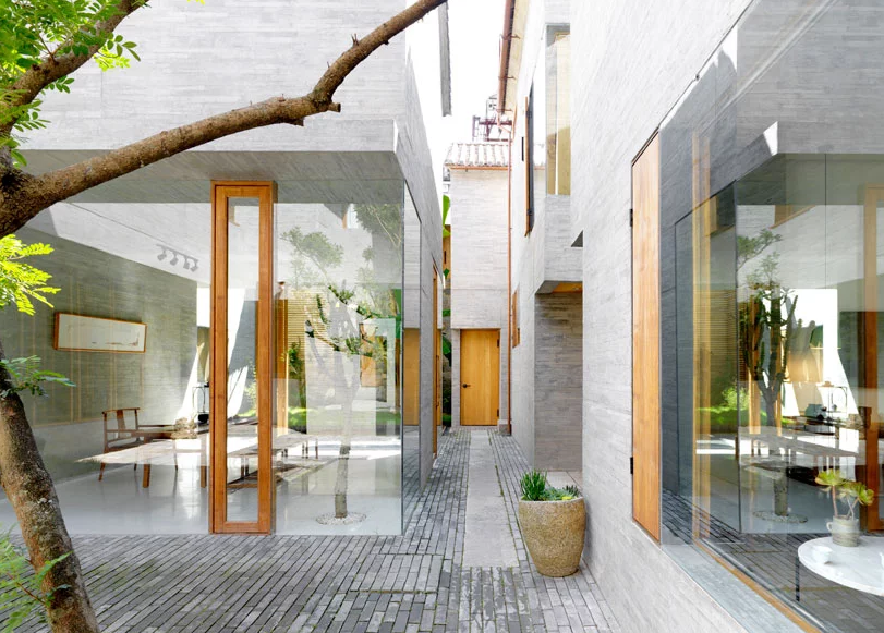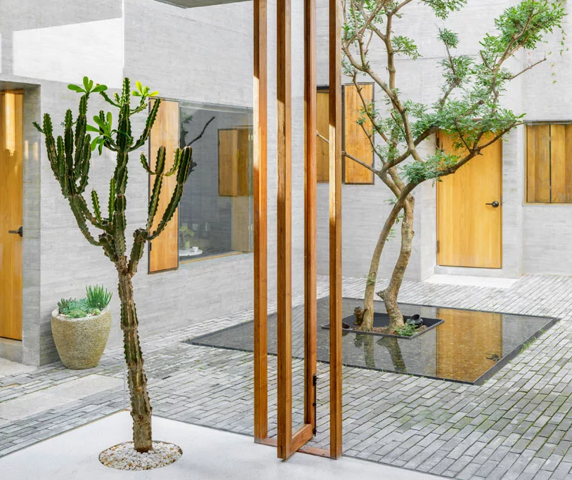 庭院經常有一天中某些時間太暗的缺陷; 然而,sunyata酒店沒有這個問題。朝陽建筑師設計了一個允許光線和視覺透明度的方案,使庭院成為一個開放的空間,光線投射到各個角落,陰影和陽光混合在一個舒緩的陰陽之中。玻璃飛機是如此專業地安裝,即使是人類也會懷疑它們的存在/知道空間的起點和終點。